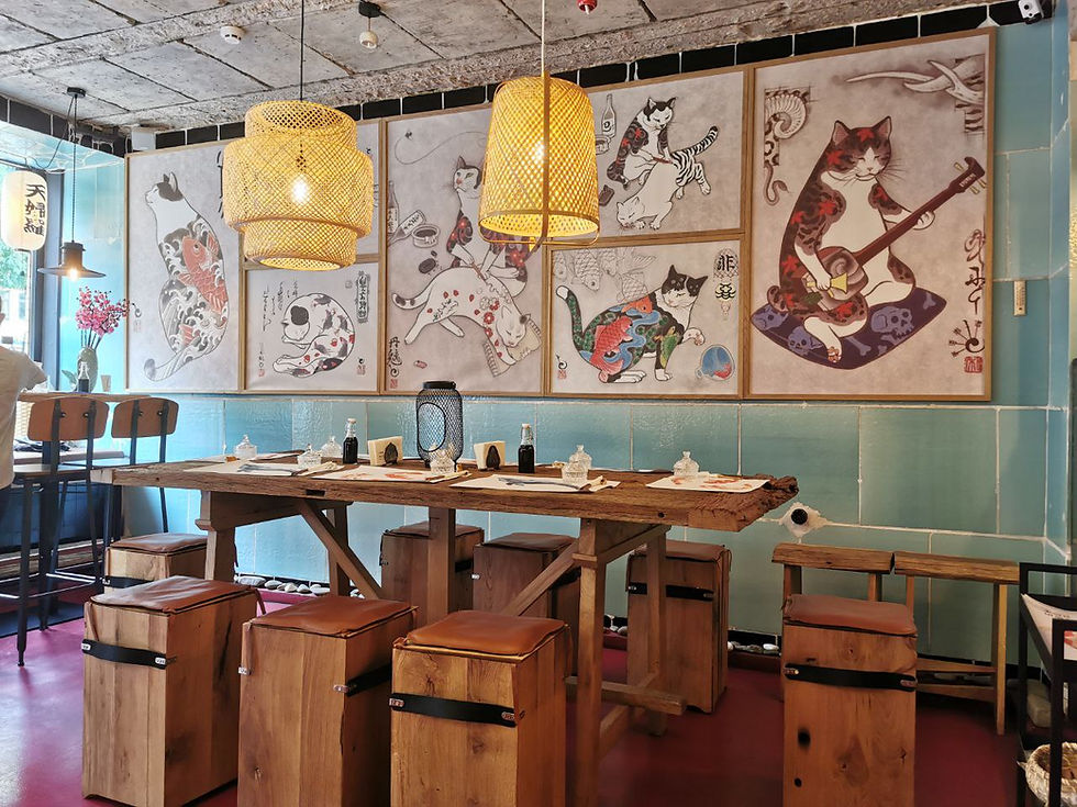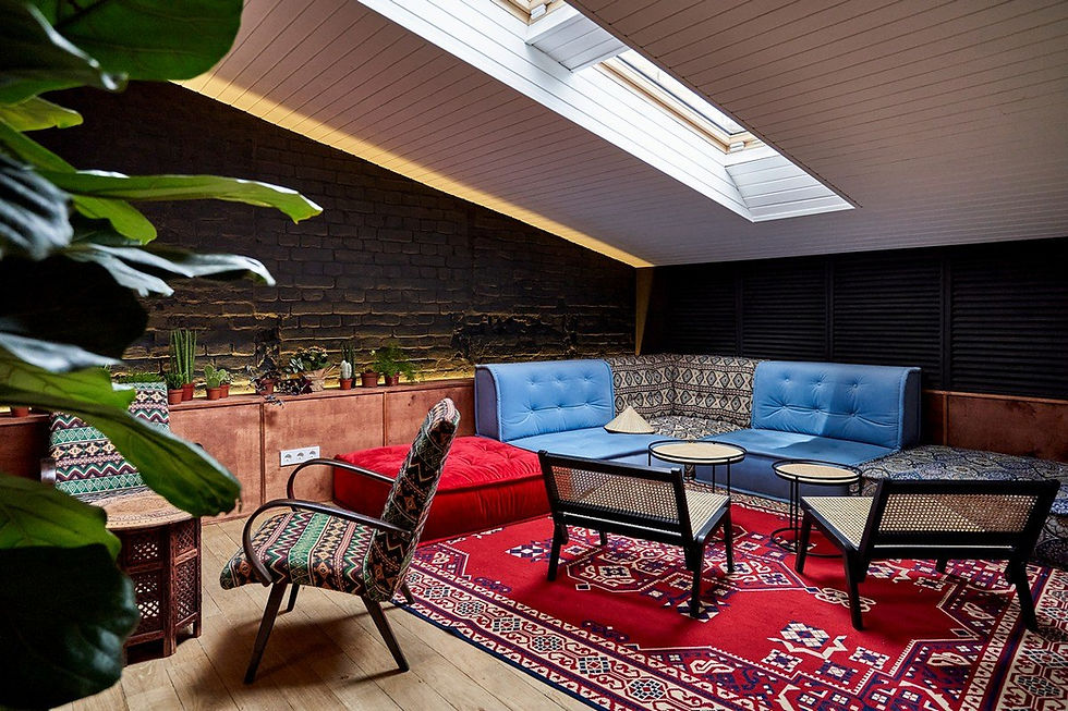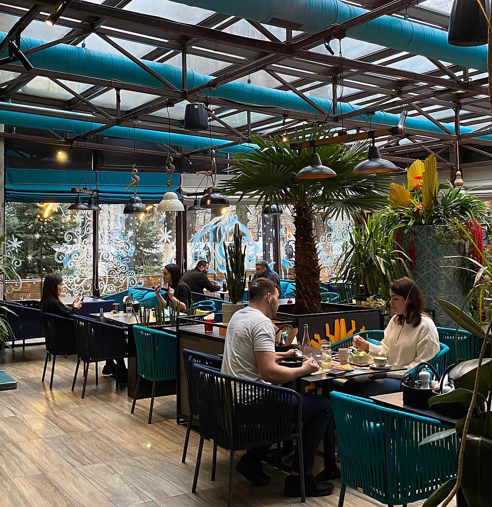 Large chandelier, big library, cozy emerald sofas, hidden terrace, delicious food & drinks.
